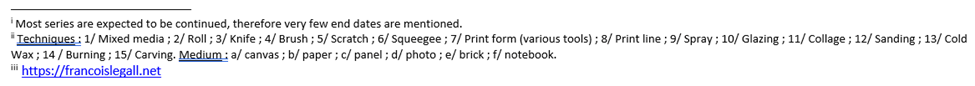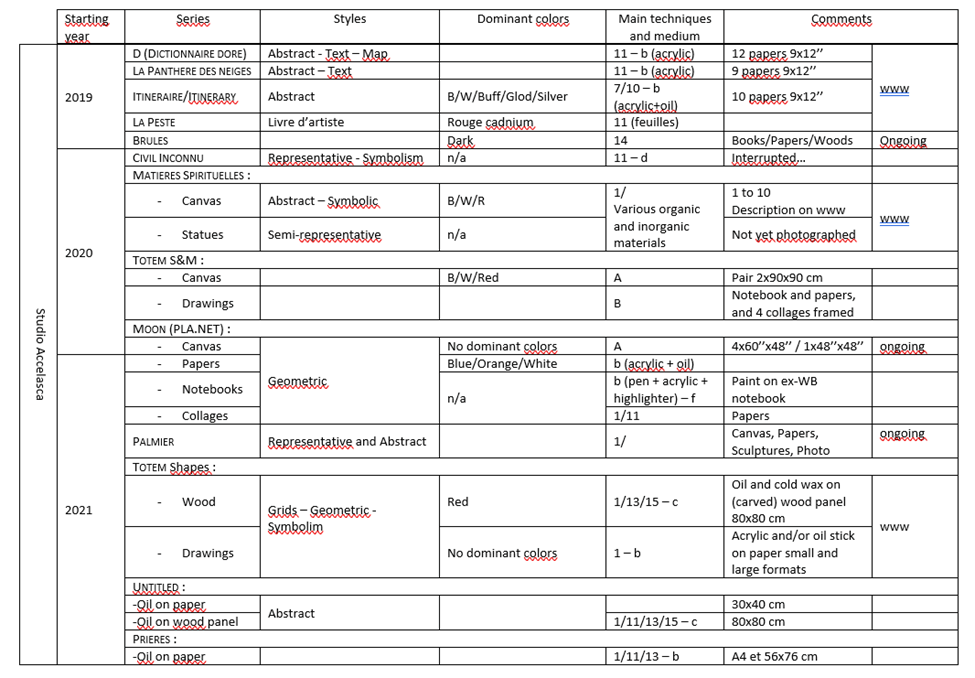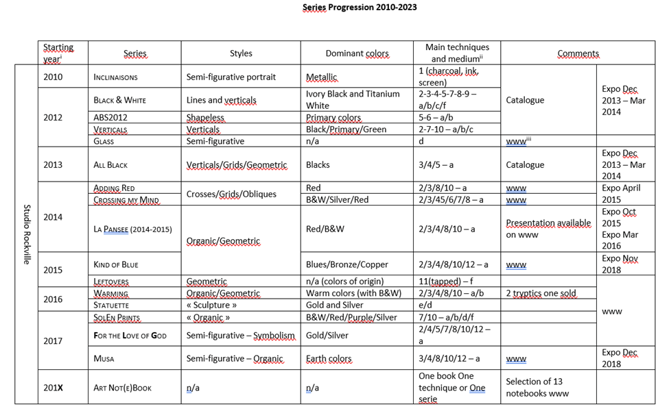 Series started in 2010 with Inclinaisons, an experiment of mixed-media semi-figurative portraits. Starting in 2012, each year saw the production of at least one new series. Most of them are open-ended: they could be complemented with other pieces for years following their initiation. La Pansée, 2015, is one notable exception of a series of 12 paintings forming a large piece. Each series has its specific style (mostly abstract with a small number of exceptions of semi-figurative imagery), color palette and set of techniques. They are usually produced on various media with a few exceptions. They are presented in the section ARTWORKS in reverse chronological order.