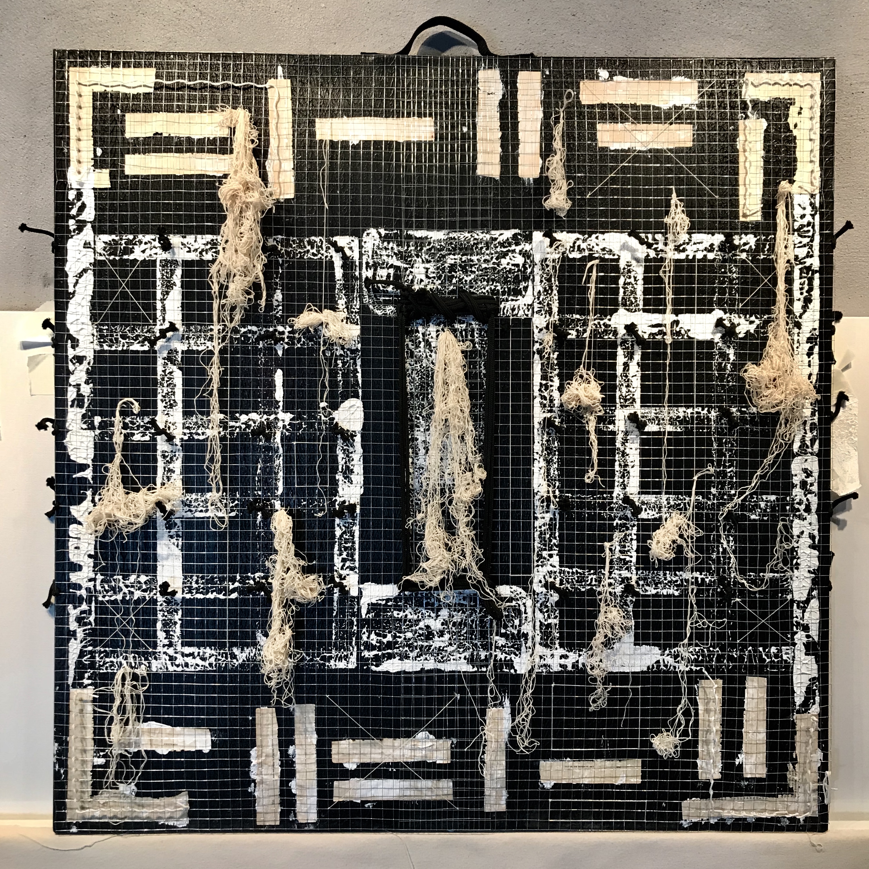 GRILLE. Châssis entoilé 91×91 cm avec poigné nylon; acrylique noir ivoire et blanc de titane ; collage papier « Les hommes en blanc » d’André Soubiran ; grillage ; fils de coton de toile ; cordon et clous. 4.2020