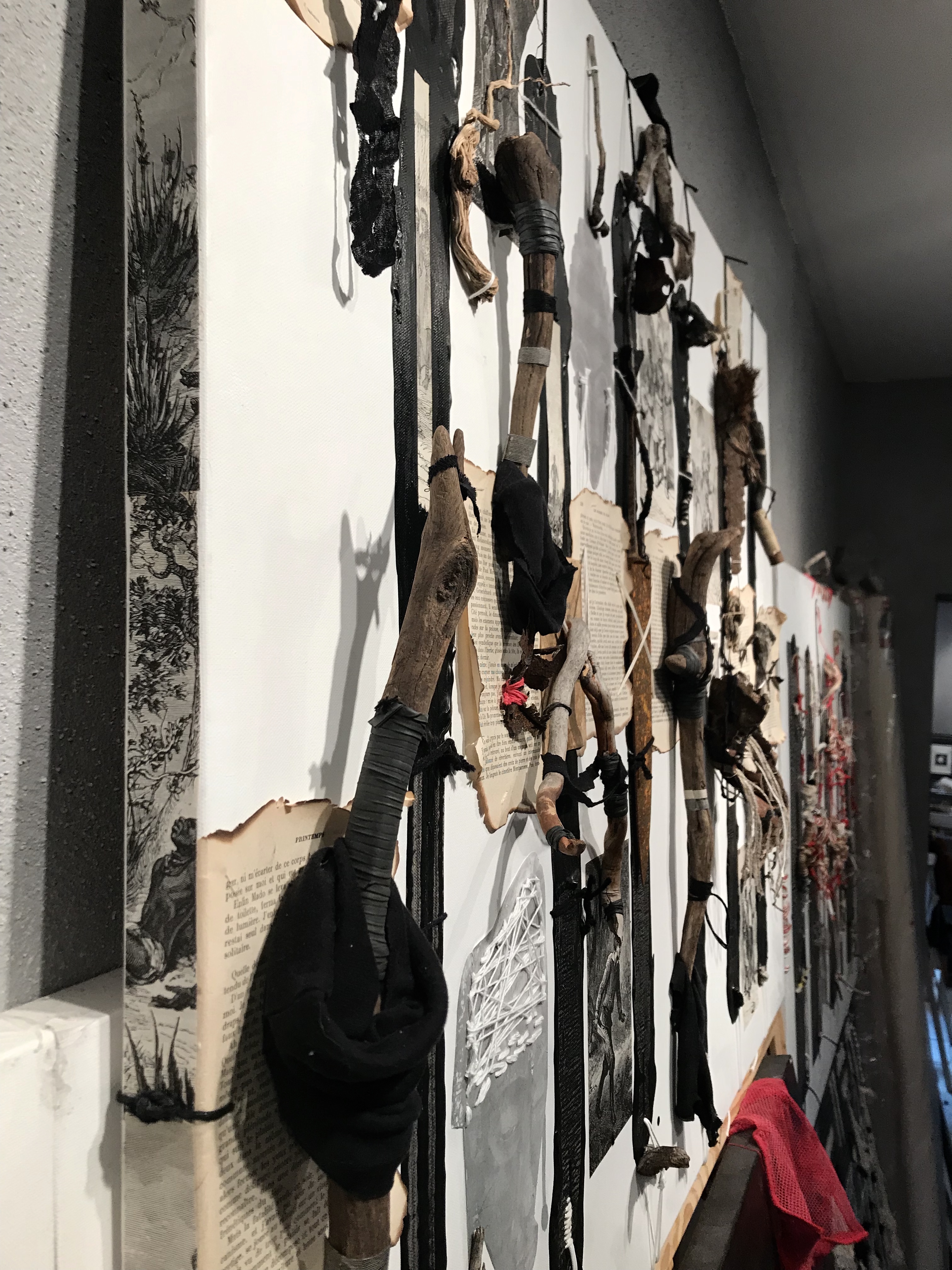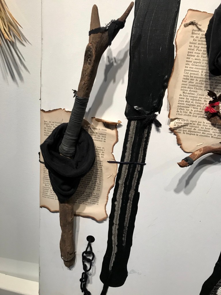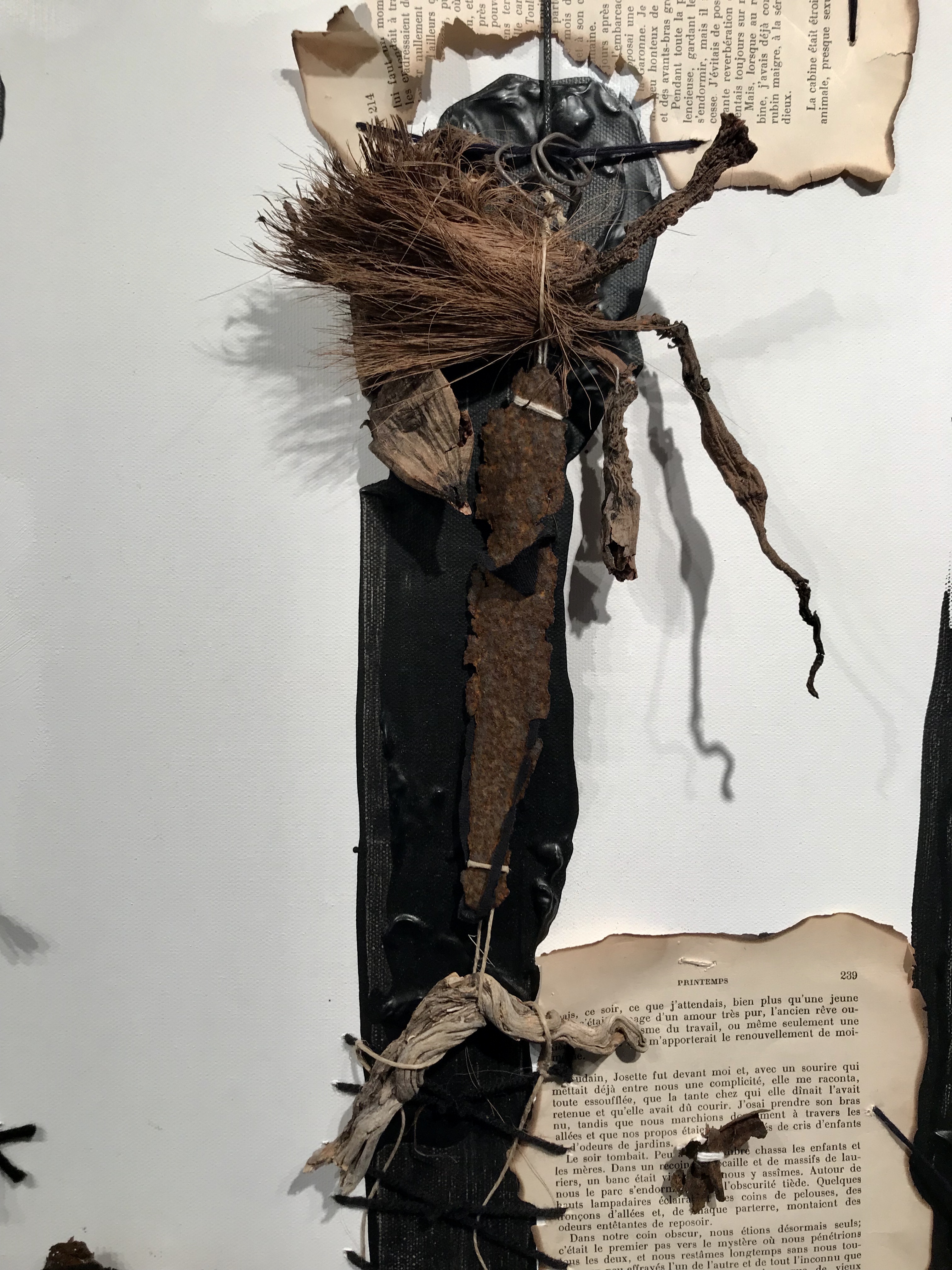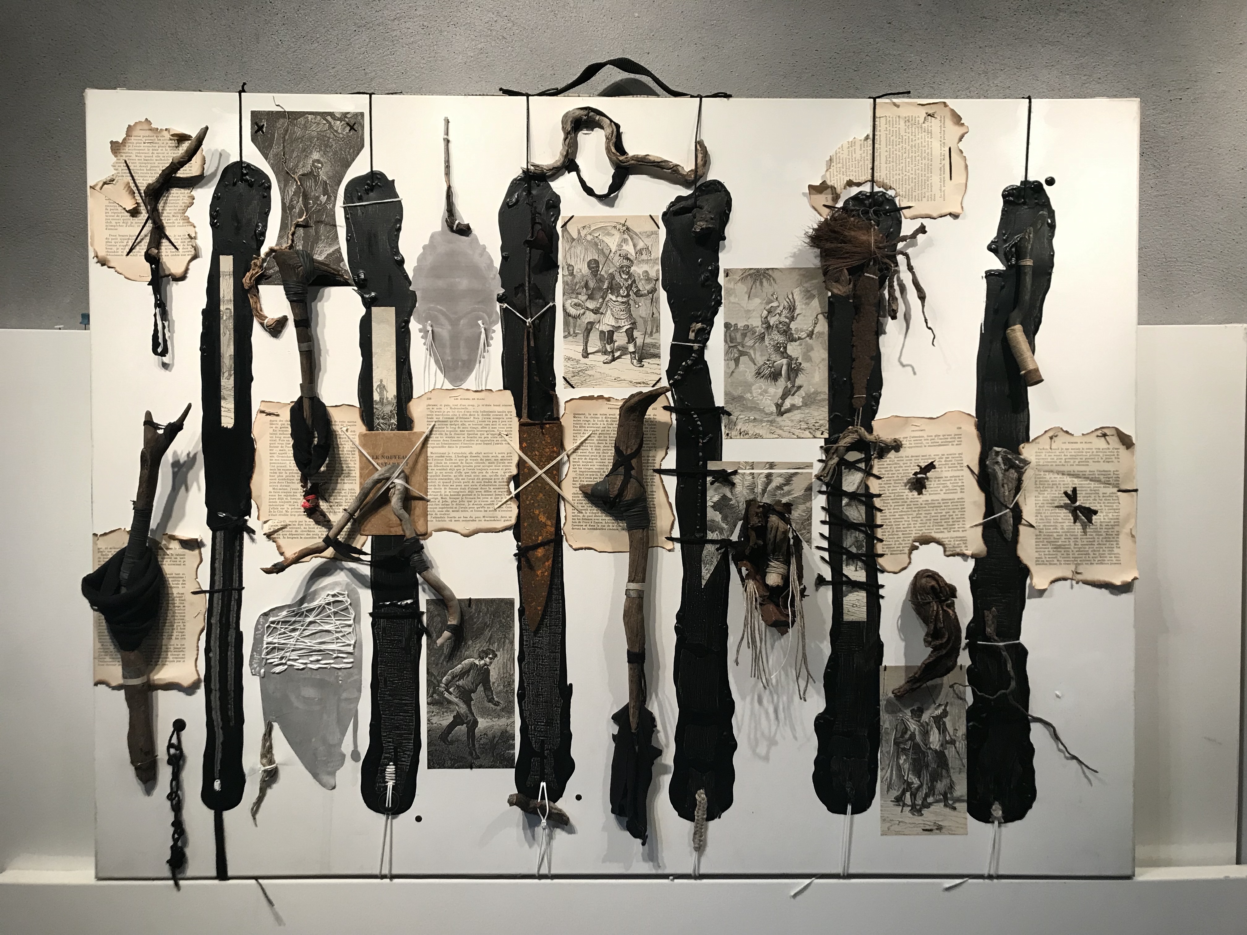 FARDEAU. Châssis entoilé 91×122 cm ; toile coton préparée ; peinture acrylique noir ivoire ; illustrations collées de Henri Meyer pour « Un capitaine de quinze ans » de Jules Verne, photocopies collées-cousues masques africains collection personnelle, pages brûlées et cousues « Les hommes en blanc » d’André Soubiran, couverture Nouveau Testament édité en 1945 ; bois et branches mortes, racine d’Asphodèle et feuille d’Arbousier séchées ; tissus, fils, ficelles, fil de fer, papier, chambre à air ; boîte de conserve, plaque de métal, et lame de couteau rouillées, et cartouche de calibre 12. d.2.2014-t.4.2020.