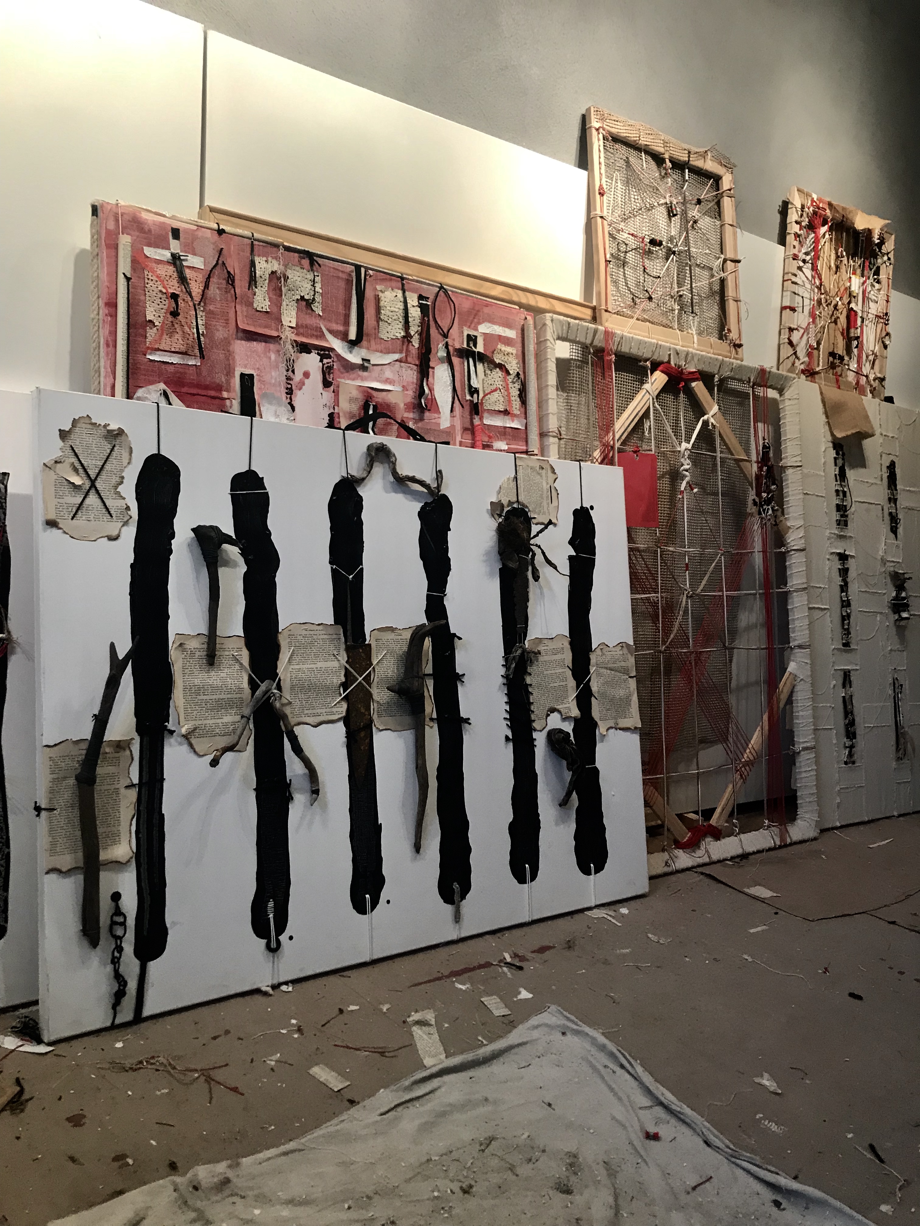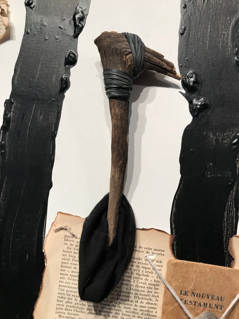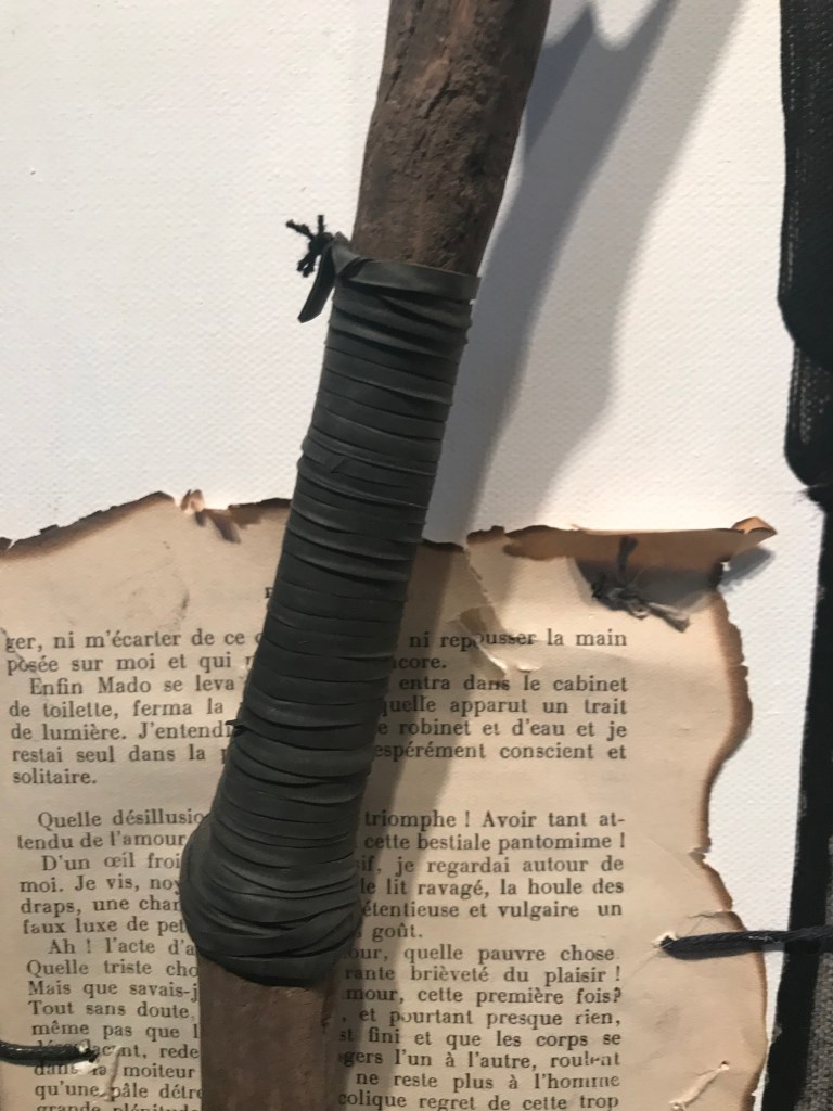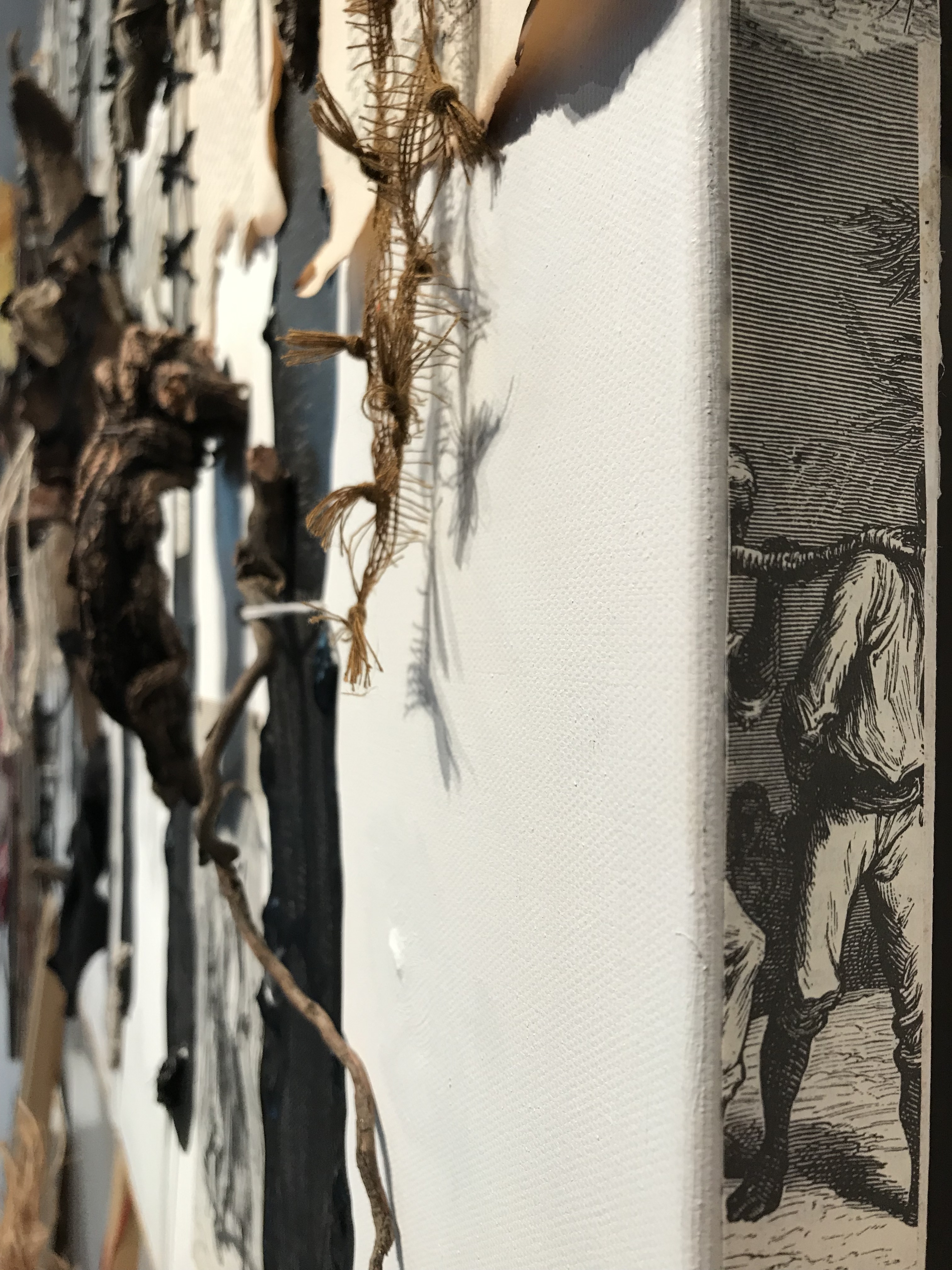FARDEAU. Châssis entoilé 91×122 cm ; toile coton préparée ; peinture acrylique noir ivoire ; illustrations collées de Henri Meyer pour « Un capitaine de quinze ans » de Jules Verne, photocopies collées-cousues masques africains collection personnelle, pages brûlées et cousues « Les hommes en blanc » d’André Soubiran, couverture Nouveau Testament édité en 1945 ; bois et branches mortes, racine d’Asphodèle et feuille d’Arbousier séchées ; tissus, fils, ficelles, fil de fer, papier, chambre à air ; boîte de conserve, plaque de métal, et lame de couteau rouillées, et cartouche de calibre 12. d.2.2014-t.4.2020.