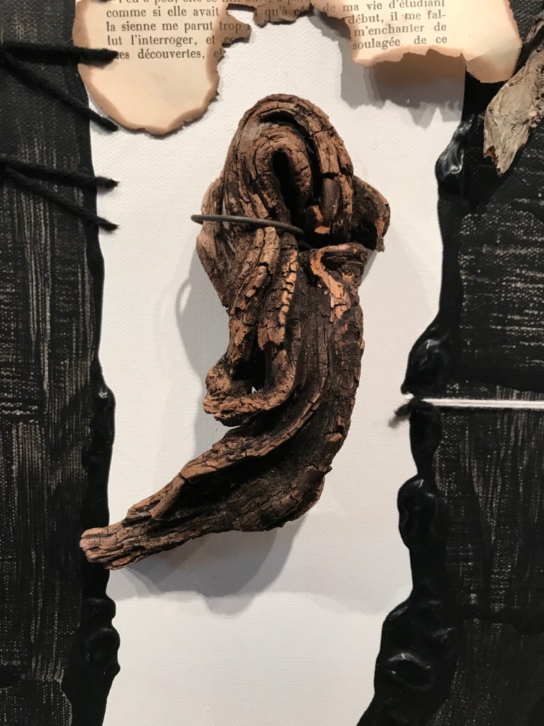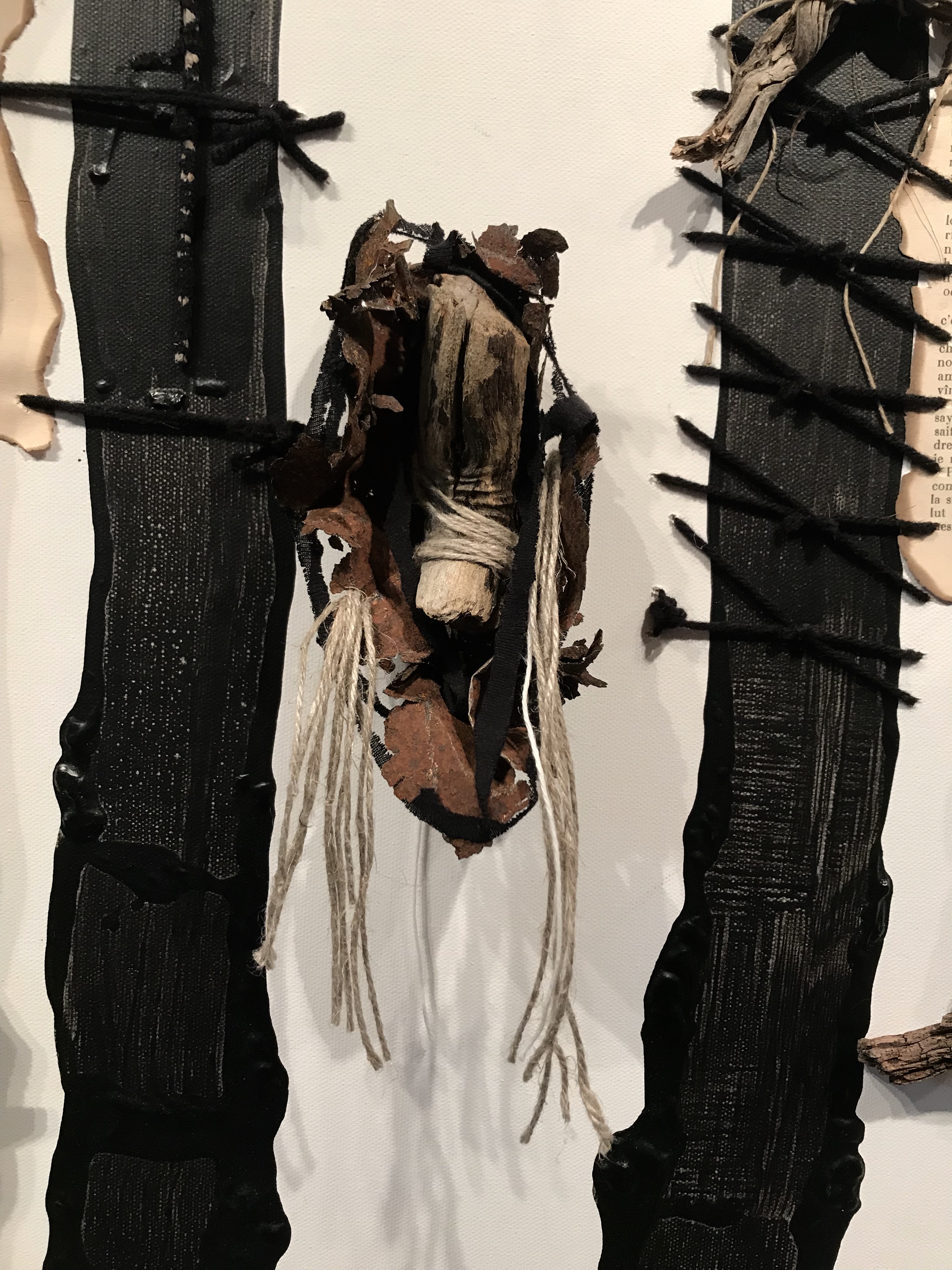 Détail 3 Bois (Chambre à air, T-shirt, Page brûlée-cousue, Acrylique, Fil-Ficelle)Détail 6 Bois (Fil de fer, Page brûlée-cousue, Acrylique, Fil-Ficelle)